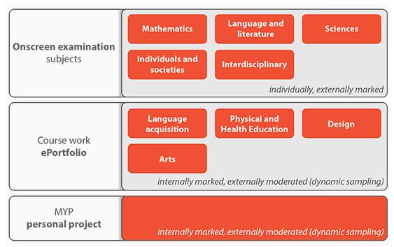 內(nèi)部評估分為課程作業(yè)與個人設計。課程作業(yè)包括四個學科組:習得語言;體育和健康教育;設計;藝術(shù)。